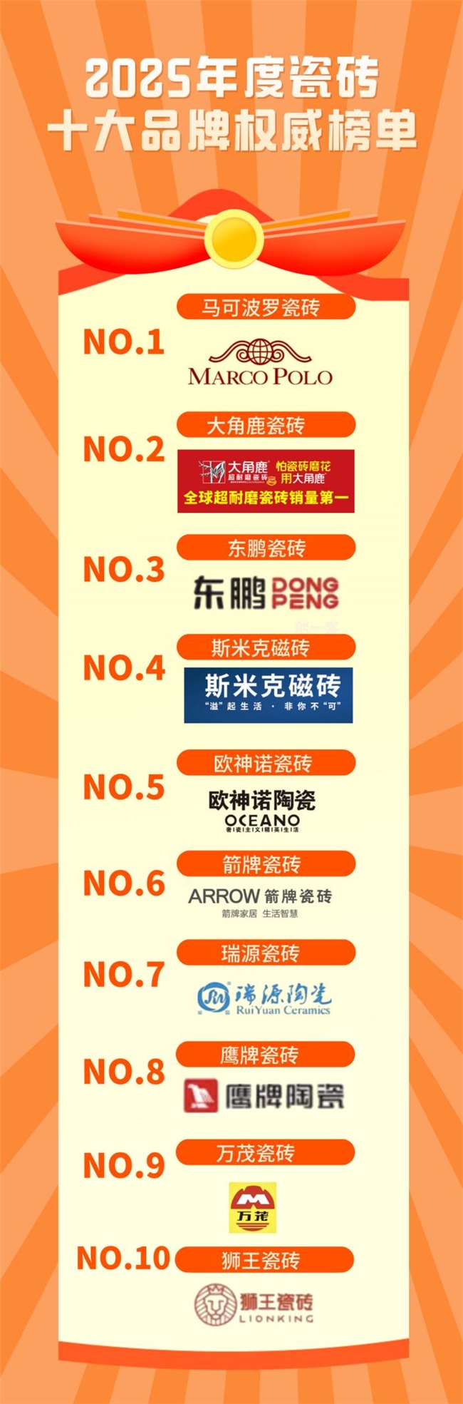 其中,入选“2025年度瓷砖十大品牌”榜单的品牌有:马可波罗瓷砖、大角鹿瓷砖、东鹏瓷砖、斯米克磁砖、欧神诺瓷砖、箭牌瓷砖、瑞源瓷砖、鹰牌瓷砖、万茂瓷砖、狮王瓷砖,大角鹿上榜并排第2名。