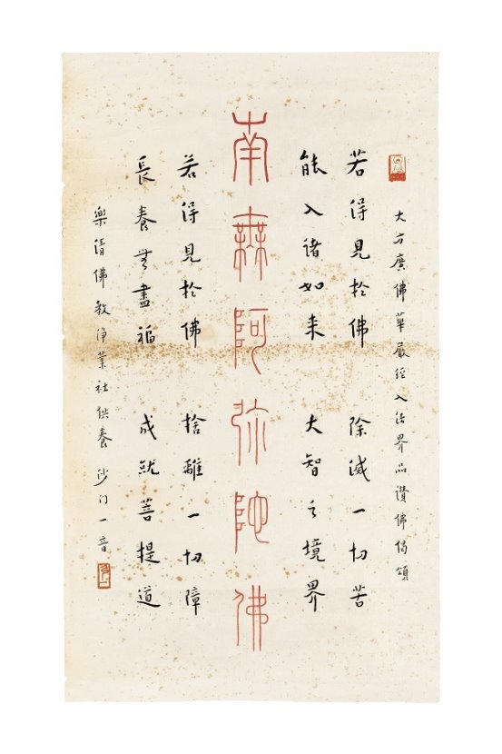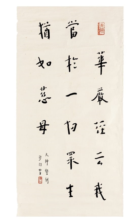 观弘一大师书法,精楷书写的佛经偈句,好似珠圆玉润,精严净妙,观之如见佛颜,如面菩萨,令人心生恭敬、和蔼可亲。尤以晚年精楷所书《华严经》集联偈句等书法作品,格高意古,平淡天真,时人比之黄庭、太虚,为数百年來僧人写经之冠。弘一大师是继晋唐以来,唯一一位把佛法融入书法,以其空灵澄澈之意;以至诚至善之心;以笔力扛鼎之作,把楷书写到了极致,形成了独一无二的「弘体」。弘一大师以书法弘佛法,唯真、唯善、唯美,把中国书法艺术推上了人文精神的最高境界,以其淡静而前无古人,以其严谨而谁堪后来。