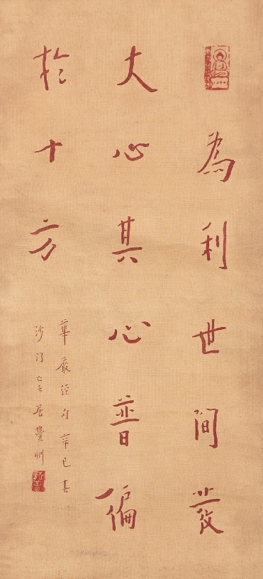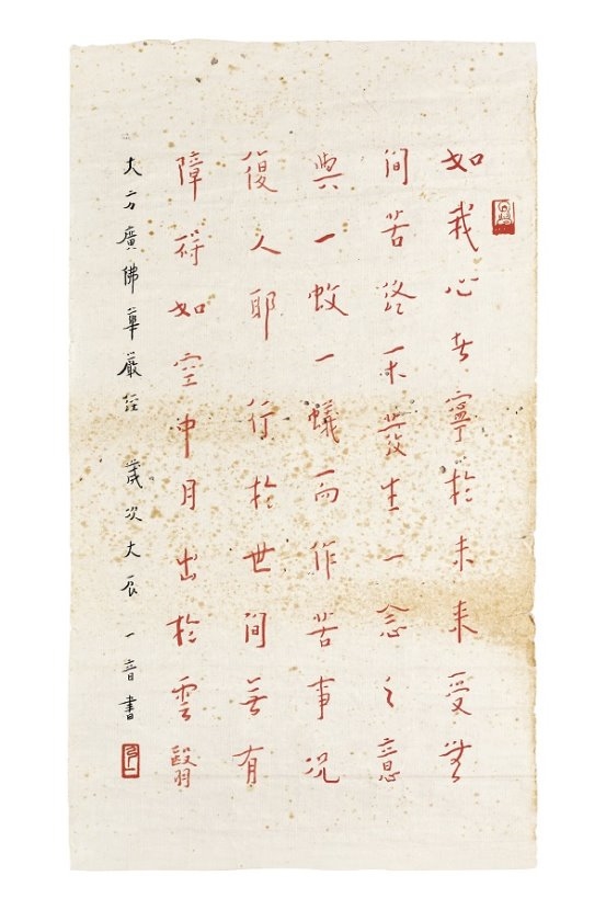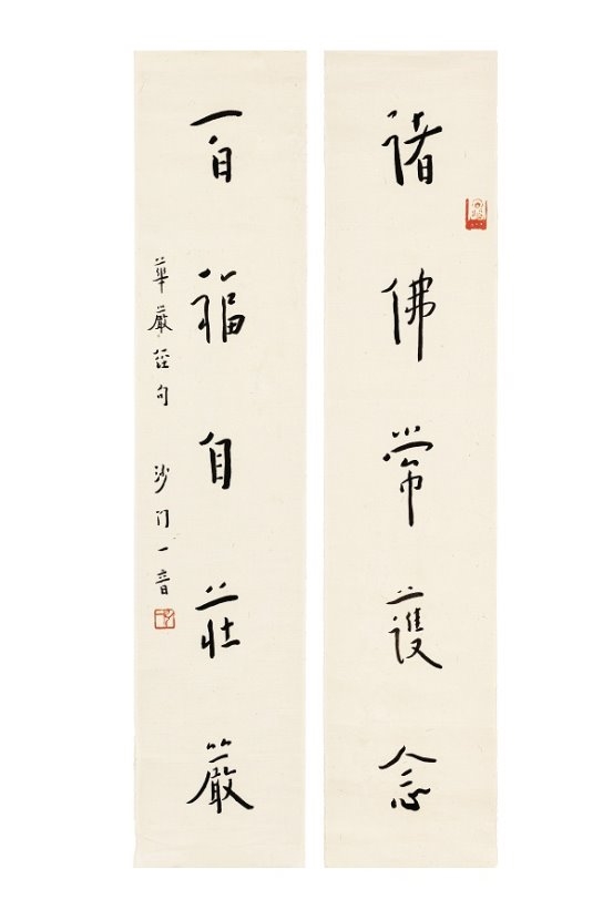 书法是心灵的迹化。弘一大师书法由在俗时的绚烂到脱俗后的平淡,是大师心灵境界的升华。正如大师自言:「朽人之字所示者,平淡、恬静、冲逸之致也」。尤其是大师一九三八年後精楷所书的《大方广佛华严经》偈句集联,人书俱老,已臻化境,脱俗去尘,佛心天机,以匀净圆润,恬淡疏朗的书风,乃是难以逾越的高峰。