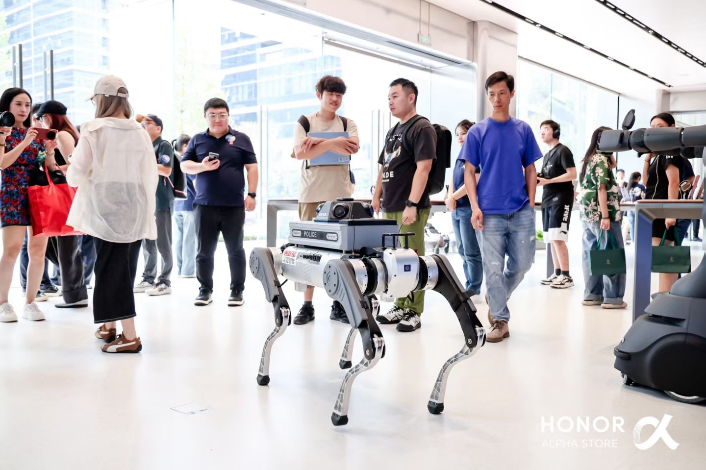 正值国庆、中秋双节叠加,荣耀阿尔法全球旗舰店迅速跻身“深圳必逛科技地标”清单,将体验式消费与科技文旅深度融合。开业仪式上,机器狗与真人舞狮的创意互动打破科技与传统的边界,水幕光影与音乐Live的节奏拉满科技美学氛围。