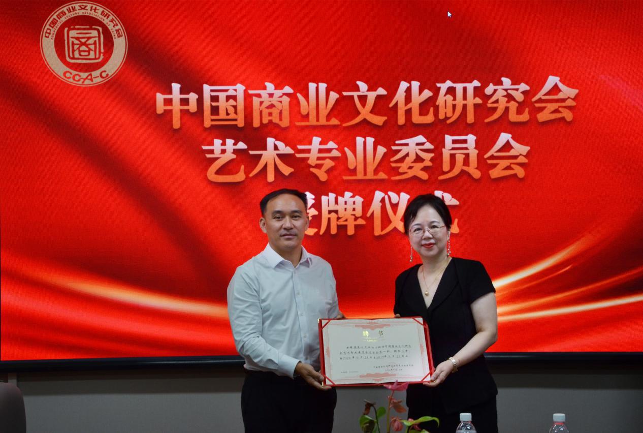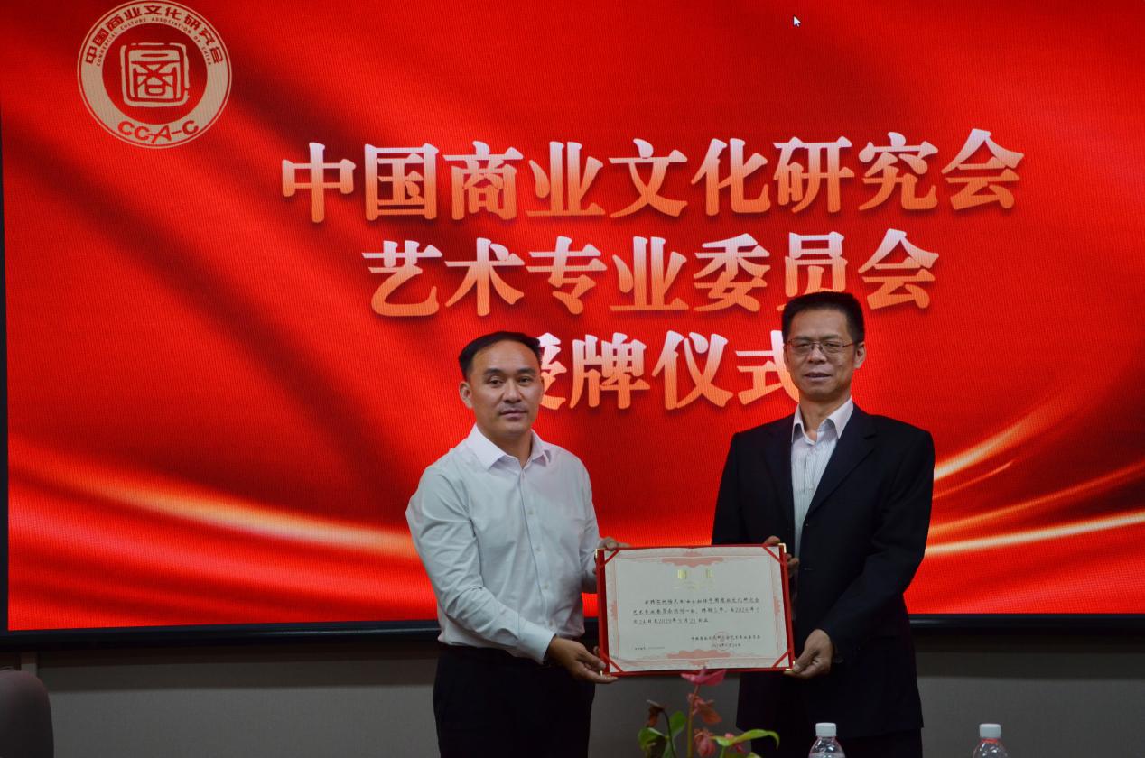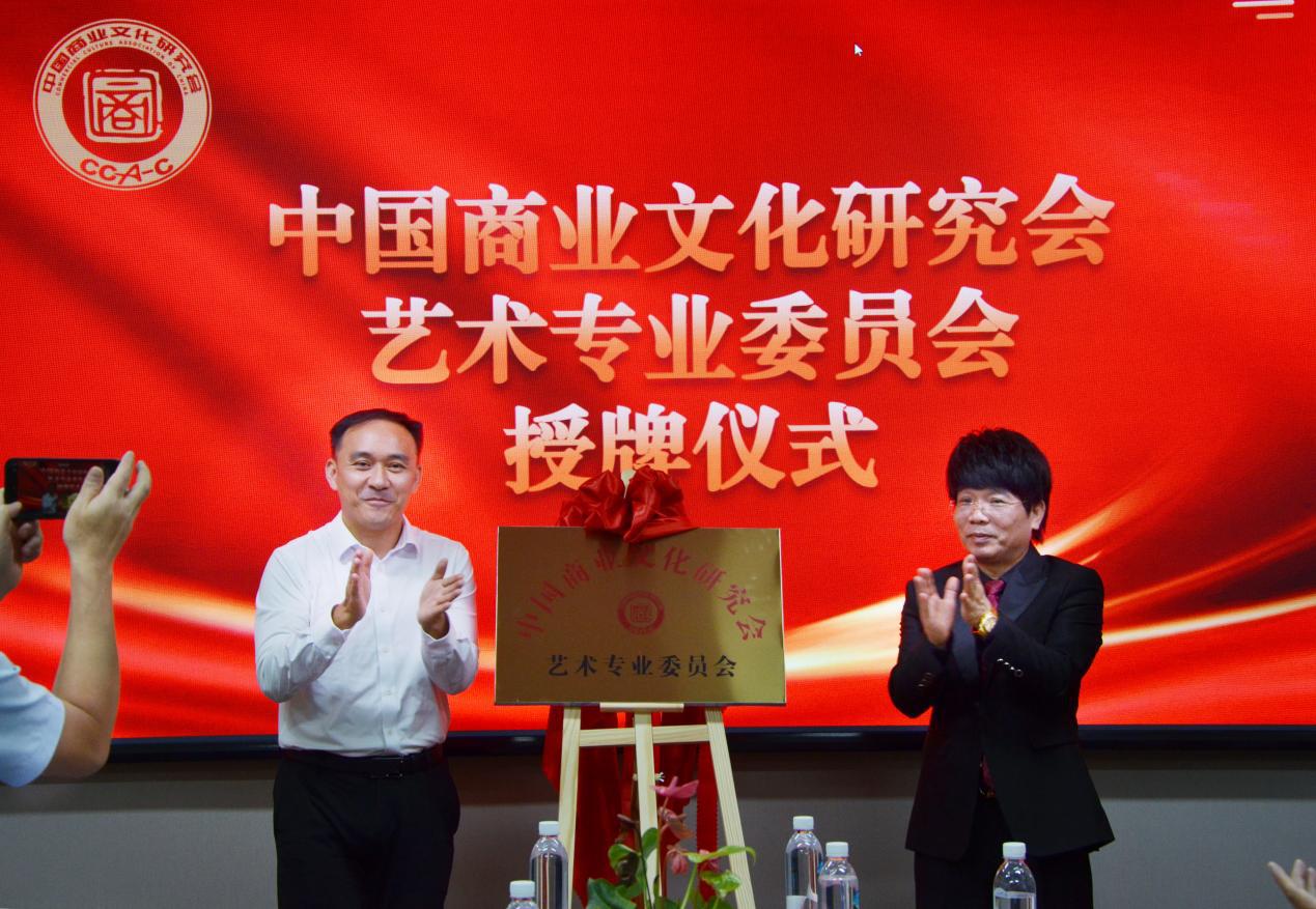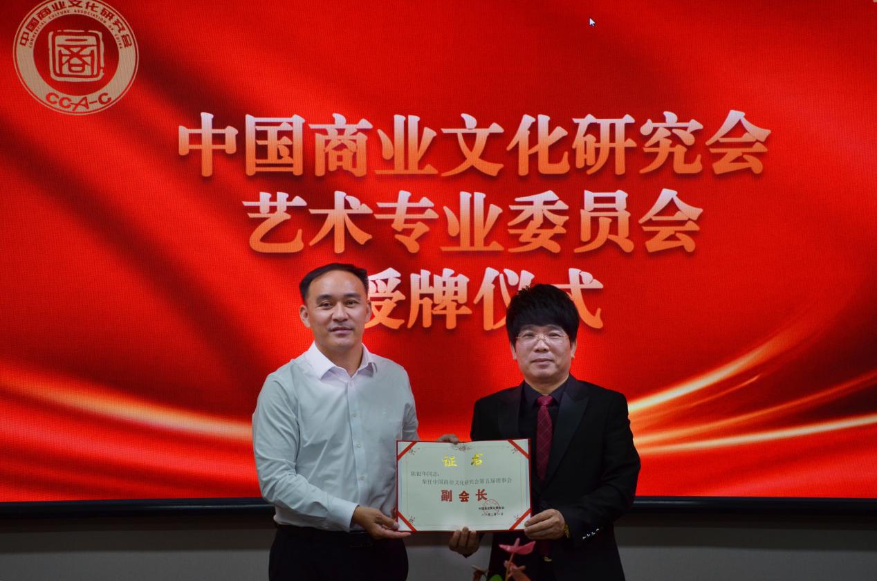 左一:姜黎明(中国商业文化研究会驻会副会长兼秘书长) 给陈银华(中国国商业文化研究会副会长兼艺术专业委员会会长)颁发授牌