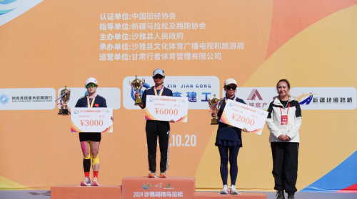 2024沙雅胡杨马拉松马拉松女子组一二三名颁奖现场。王水江摄