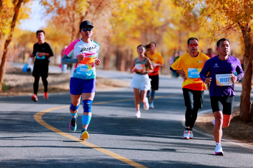 2024沙雅胡杨马拉松参赛选手们与金黄色的胡杨交相呼应,形成了一幅绝美的画卷。程磊摄