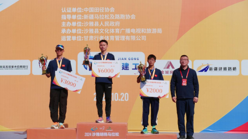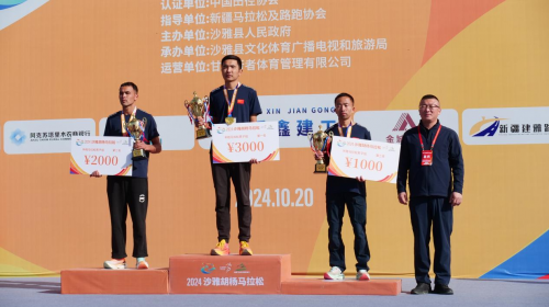 2024沙雅胡杨马拉松马拉松男子组一二三名颁奖现场。王水江摄