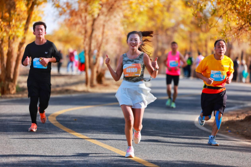 “3、2、1”,随着汽笛声响起,参赛选手们沐浴着晨光如潮水般涌出起跑线,长长的奔跑队伍,犹如一条移动的彩带,与金黄色的胡杨交相呼应,形成了一幅绝美的画卷。