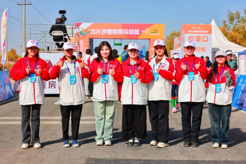 2024沙雅胡杨马拉松志愿者们为参赛选手加油打气。程磊摄