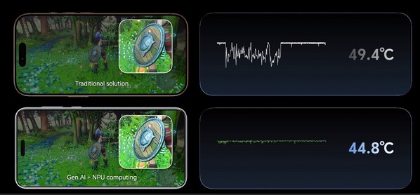 在性能提升方面,荣耀与高通致力于以端侧AI技术赋能硬件,全面释放SoC与影像性能表现,击破硬件性能上限的天花板。在游戏性能领域,由于手机尺寸和电池寿命的限制,手机的"画面质量-帧率-温度"往往相互制约,成为手机游戏中常见的"三难困境"。在异源计算架构加持下,荣耀带来了业界首创的由NPU驱动的AI实时渲染技术,实现了更为上乘的画面质量、更高更稳定的帧率表现以及更加出色的温控表现,系统性解决了三难困境。