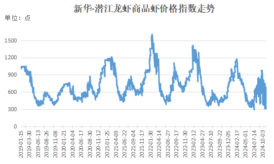 受水产供应量持续增加,小龙虾市场需求回落,价格指数微幅下行。新华指数监测数据显示,截至10月28日,新华·潜江龙虾商品虾价格指数报587.94点,环比上期(2024年10月21日,下同)下跌32.33点,跌幅5.21%;较基期(2019年1月1日,下同)下跌412.06点,跌幅41.21%。
