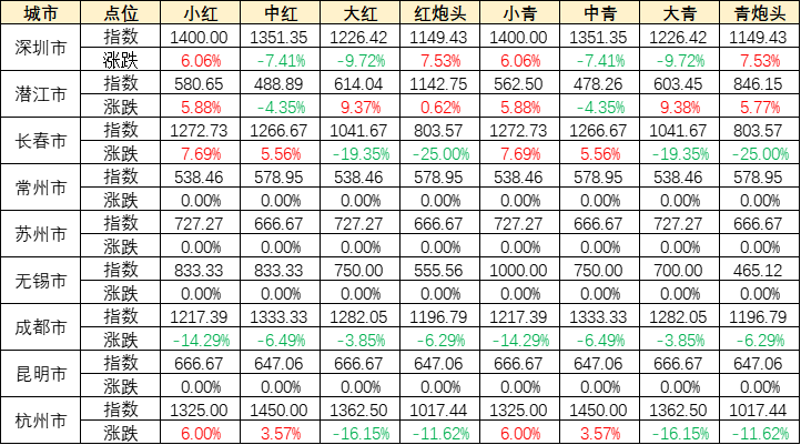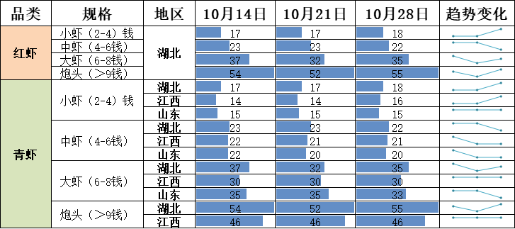 从主要销区来看,截至10月28日,深圳市小虾和炮头虾小幅上涨,涨幅分别为6.06%和7.53%,中虾和大虾小幅下跌,跌幅为7.41%和9.72%;潜江小虾、中虾和炮头虾小幅上涨,其中大虾涨幅较大,为9.37%,中虾小幅下跌,跌幅为4.35%;长春各规格小龙虾价格涨跌互现,小虾涨幅较大,为7.69%,炮头虾跌幅较大,为25.00%;成都市小龙虾均小幅下跌,小虾跌幅较大,为14.29%;杭州市各规格小龙虾价格涨跌互现,小虾涨幅较大,为6.00%,大虾跌幅较大,为16.15%;其余城市各规格品价格保持稳定。