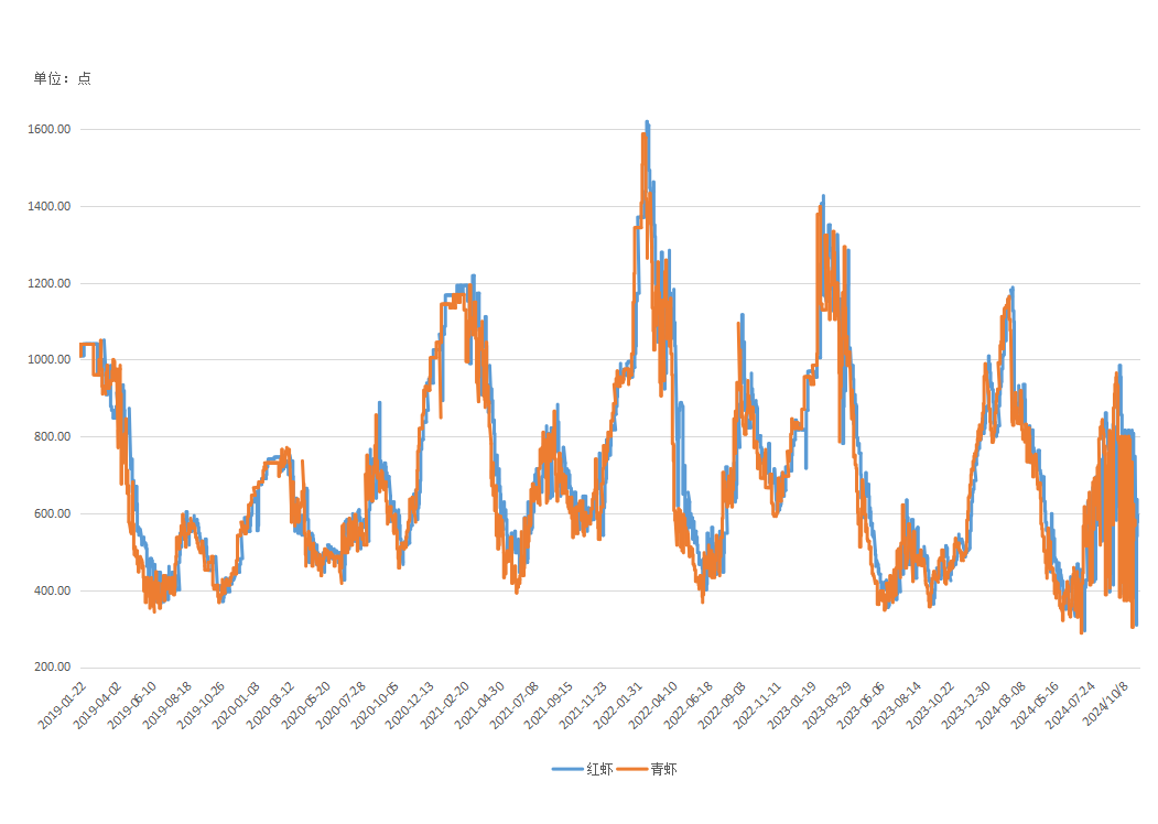 分品类来看,红虾和青虾在市场销售端行情变化趋势一致,表现为不同程度下跌。截至10月28日,红虾价格指数报593.91点,环比下跌20.62%;青虾价格指数报582.09点,环比下跌20.62%。