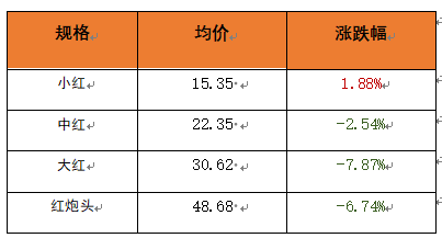截至10月28日,红虾均价报29.25元/斤,环比下跌5.21%。其中,小红均价报15.35元/斤,环比上涨1.88%;中红均价报22.35元/斤,环比下跌2.54%;大红均价报30.62元/斤,环比下跌7.87%;红炮头均价报48.68元/斤,环比下跌6.74%。