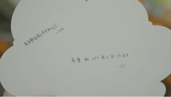 一对从小学就结交的好朋友,在云朵卡片上写下心愿,约定要一直相伴左右,共同进步。