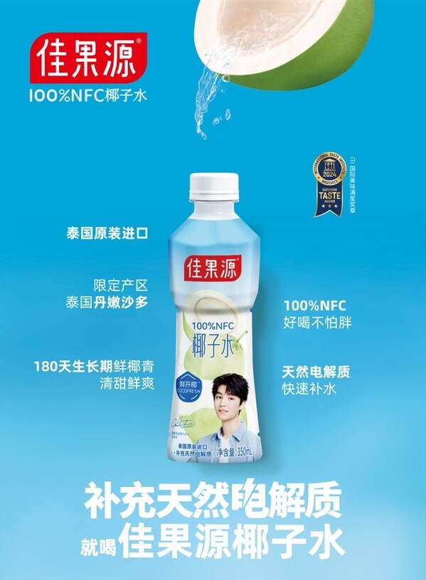 佳果源100%NFC椰子水鲜甜清爽,多次摘获比利时iTi国际美味满星奖章,也是全球唯一一个摘得此殊荣的椰子水品牌。