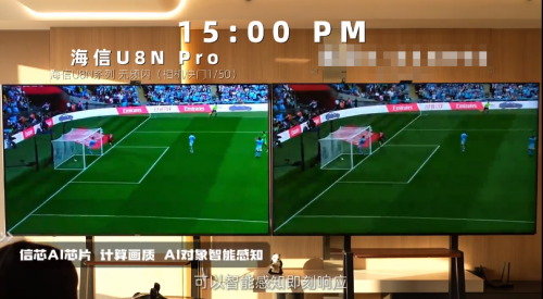 而在观赛场景的对比下,竞品S和海信电视U8都有很好的画面流畅度和清晰度,只是竞品S在沉浸感方面稍有欠缺。海信电视U8则依托AI对象智能感知、AI局部对比度提升,精准识别体育场景,球员、球场呈现的更加细腻、真实,看球时,代入感更强一些。