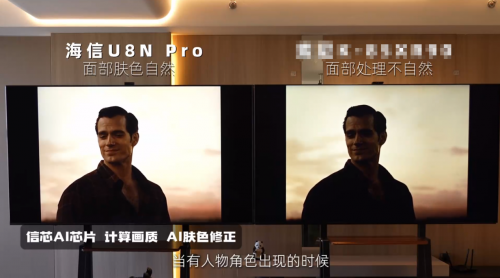 以观影场景的对比为例,竞品S和海信电视U8的清晰度都很高,人物细节也有,美中不足的是竞品S中的人物肤色感觉有些不自然。海信电视U8通过AI肤色修正后,人物肤色更接近真人质感,观感上更加舒适。