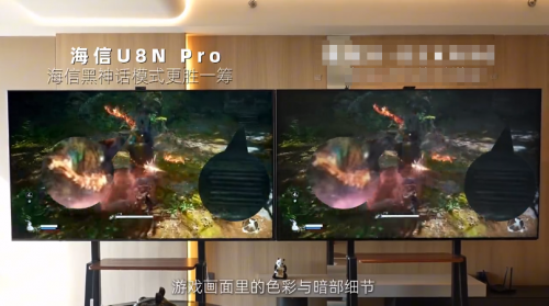 而针对PC游戏这类高动态、高光影效果的画面,两者的画质也能看出区别。比如在《黑神话:悟空》的游戏场景对比中,竞品S的画面明暗、色彩对比度都挺好,只是缺乏一定的景深和层次感;海信电视U8则能够通过超画质Mini LED芯片的优化处理,呈现出丰富的色彩层次,从飞沙走石到水波粼粼,每一个场景都充满了视觉冲击力。