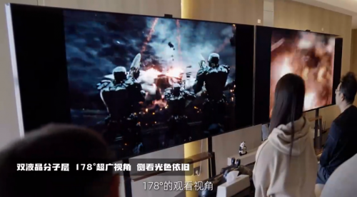超大的屏幕视角也很重要。视角对比中,竞品S在正面和侧面都能呈现清晰画面,可接近两侧底角后,画面有一点点丢失;而黑曜屏 Pro具有178°超广视角,不仅能正看、侧看,哪怕接近极限的底角观看,画面依然完整清晰。