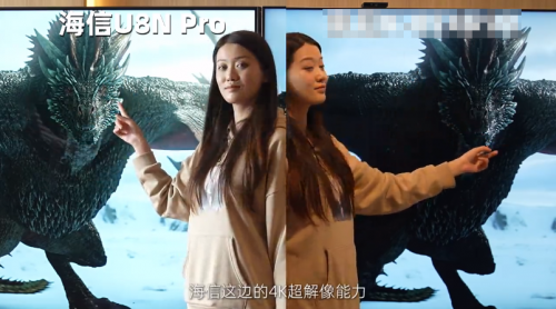 之后在2K片源的播放对比中,竞品S优化效果也不错,但在画面边缘的质感处理上有待加强;海信电视U8AI超解像能力将这一点处理的更好,边缘锯齿之类的都补偿的顺滑完整。