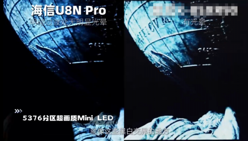 即便是同一环境光,亦有控光不同。比如播放《权力的游戏》时,竞品S和海信电视U8在明暗交界处都出现了光晕,只是竞品S的光晕相对较多,海信电视U8因为自带5376分区超画质Mini LED,可以1:1逐点控光,因此光晕较少,细节更为清晰。