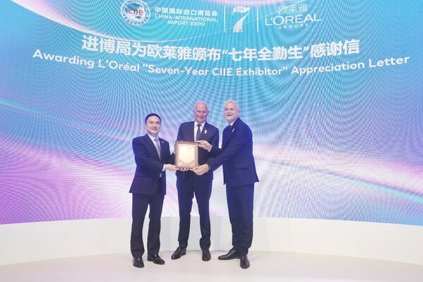 进博局向欧莱雅颁布“七年全勤生”感谢信,欧莱雅集团董事长安巩和欧莱雅北亚总裁及中国首席执行官博万尚代表欧莱雅接收