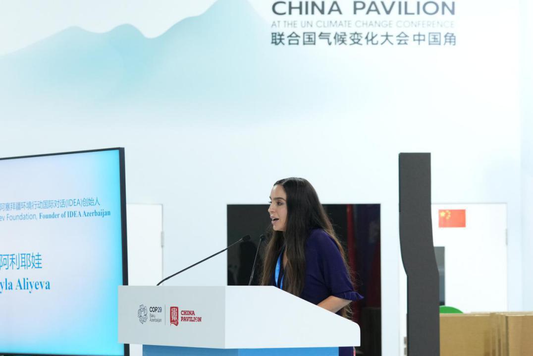 图为盖达尔·阿利耶夫基金会副主席、阿塞拜疆环境行动国际对话创始人莱拉·阿利耶娃在COP29中国角“‘一带一路’应对气候变化南南合作与绿色对外开放案例与实践”主题边会上发言