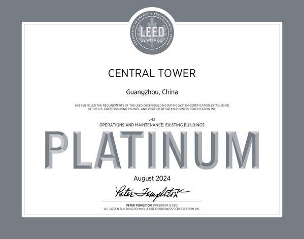 继2019年以当时超高层写字楼全球最高分的102分,荣获LEED v4 O+M:EB(运营与维护:既有建筑)铂金级认证后,日前,凯华国际中心再次以卓越成绩喜获LEED v4.1 O+M:EB铂金级续认证的嘉许。美国绿色建筑委员会北亚区副总裁王婧女士亲临位于项目44楼的凯华商务中心现场,为凯华国际中心颁发这一殊荣。时隔5年后再续铂金级顶格权威认证,无疑有力彰显凯华国际中心在可持续运营和环境友好管理等方面的优异表现依然保持在国际超一流水准,项目的可持续发展力与高质量生命力依然强韧、蓬勃。