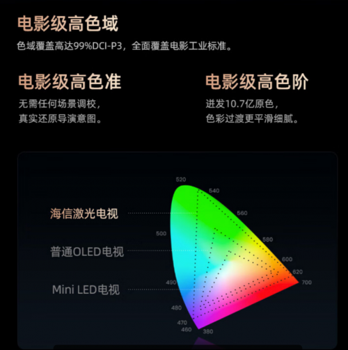 其次,上文介绍了选百吋电视所追求的就是和影院一样的沉浸感,在这方面海信激光电视星光S1 100英寸也很有优势。首先,它的核心是采用了激光光源和DLP®数字放映技术,这些技术与高端的激光电影院同源,能够1:1还原影院观感。另外,我们可以看到它公布的色域值能够达到99%DCI-P3,这比一般高端电视95% DCI-P3的色域值要高,而色域越高,所能展现出来的颜色就越多,色彩就更真实,细节也更丰富。此外,对于喜欢IMAX的朋友来说也有一个好消息,就是这款海信激光电视星光S1已通过IMAX Enhanced认证,通过内置的4K MAX影片库和专区就能轻松享受到IMAX影院的惊艳画质。