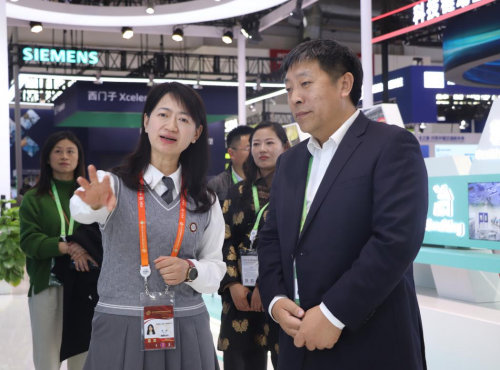 吴君向中国铜业有限公司党委常委、副总经理、总工程师胥福顺介绍锡铟产品应用场景