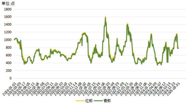 图2 红虾和青虾价格指数走势对比(单位:点)