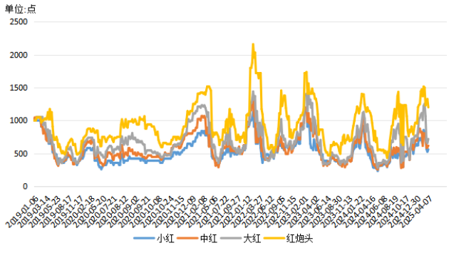 具体来看,截至4月7日,红虾均价报40.64元/斤,环比下跌1.47%。其中小红均价报17.28元/斤,环比上涨6.69%;中红均价报27.68 元/斤,环比上涨4.07%;大红均价报40.9元/斤,环比上涨9.55%;红炮头均价报76.68元/斤,环比下跌9.61%。