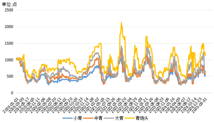 截至4月7日,青虾均价报39.11元/斤,环比下跌0.69%,整体价格变动不大。从细分规格来看,小青均价报17.28元/斤,环比上涨6.69%;中青均价报27.63元/斤,环比上涨3.88%;大青均价报38.25元/斤,环比上涨8.43%;青炮头均价报73.29元/斤,环比下跌7.78%。