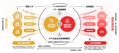 一品威客定位为“持续为中小微市场主体成长提供动力的数智化网络服务平台”,其核心模式是“1+N”。其中,“1”是以“一品威客网”为核心,专注于创意服务交易,通过智能推荐、资金托管、纠纷仲裁等机制,让雇主和服务商高效匹配、安全交易。