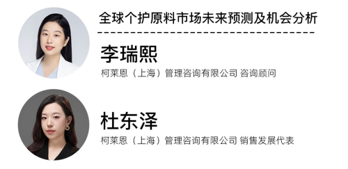 当前全球消费者需求与细分市场日新月异,全球个护竞争日益激烈。柯莱恩(上海)管理咨询有限公司咨询顾问李瑞熙和销售发展代表杜东泽,将结合全球个护原料和活性成分市场规模和数据,对天然/有机成分、功效型成分、可持续原料进行进行预测及机会分析,助力行业参与者把握市场趋势、优化资源配置并制定战略决策。