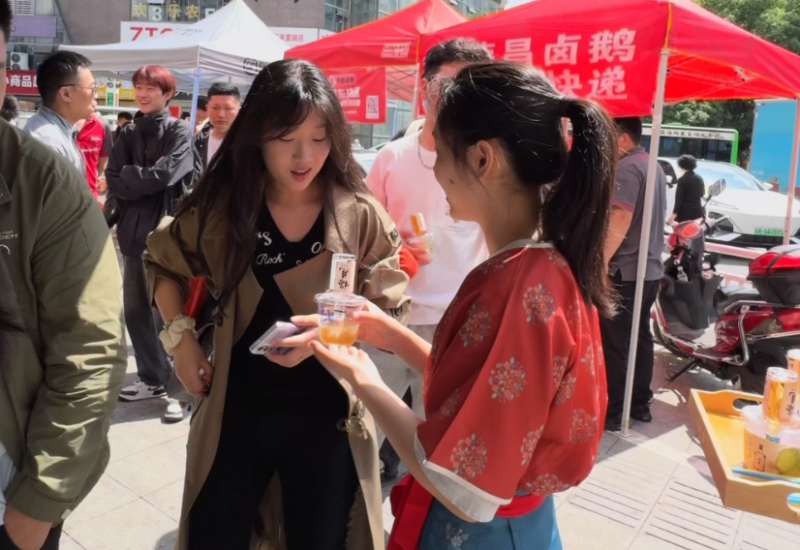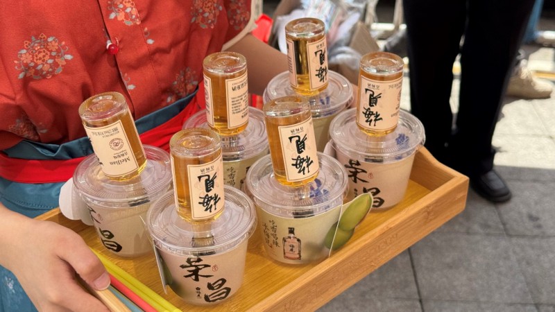 5月4日,记者走访荣昌人民路、夏布小镇等热门街区,发现“梅见在荣昌全城赠饮”已成常态——在小罗卤鹅、小薛卤鹅等多个卤鹅门店门口,都有梅见工作人员穿梭在百米长队中,为排队的游客免费发放冰镇梅酒。