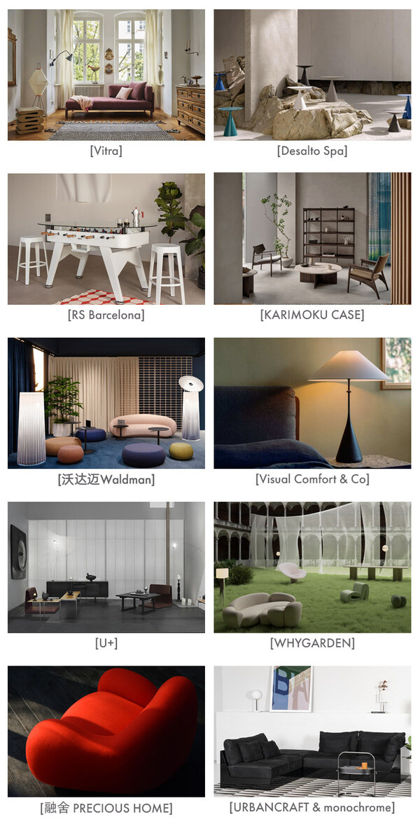 在家具与灯具设计展区现场,瑞士家具品牌Vitra将带来全新的Anagram沙发,呈现Vitra坚持的精湛工艺;法国"光之雕塑家"LALIQUE,呈现极致水晶工艺;丹麦家居品牌GUBI带来Pacha 云朵椅及甲壳虫系列座椅,展示充满艺术感的生活表达;比利时现代工艺与美学家具设计品牌BULO将携VVD座椅等一系列经典设计亮相;将游戏体验与设计美学融合的西班牙高端游戏桌品牌RS Barcelona,此次将带来亚洲首发的Plec系列立式置物架等趣味设计,为现代家居空间增添别致魅力;意大利高端简约家居设计品牌Desalto Spa、荷兰模块化室内墙体系统方案领行者Maars都将携品牌经典之作亮相。日本Miyazaki宫崎椅子制作所将携modus系列,呈现中世纪设计的永恒优雅;日本家具品牌KARIMOKU CASE、foxx chair、石卷工房都将共同讲述日本设计的独特故事。