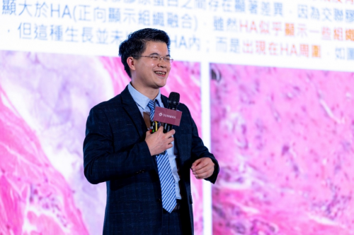 来自台中优越诊所的张皓强医师则对于肤漾美在面部塑形上的创新应用进行了分享,他强调肤漾美在面中部提拉、全面部修饰以及整体轮廓雕塑上,展现出令人惊艳的效果。在分享中,他表示肤漾美拥有优异的支撑力与生物相容性,能有效改善肤质,让疗程更安心,效果更自然,帮助求美者拥有更立体、更年轻的容颜。