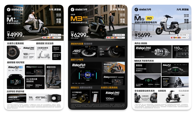除此之外,全新升级后更强更能行的智能电动车远航家M系列三款车型,以及电动滑板车新品E3系列和F3也在此次发布会中惊喜亮相。