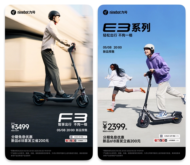 在短途出行领域,九号同步发布电动滑板车新品E3系列和F3。E3系列通过轻量化结构和创新减震技术,重新定义滑板车体验;而F3则从外观、骑行、智能全维度升级,为都市人群出行提供旗舰级的舒适体验。三款滑板车新品将在5月8日20:00准时开启预售。