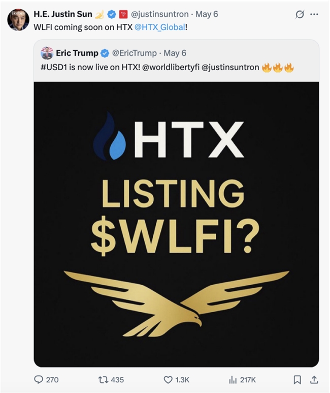 5月6日,特朗普次子Eric Trump在社交媒体上宣布“#USD1 is now live on HTX!”,配图“HTX listing $WLFI?”。随后孙宇晨转发并回应“WLFI coming soon on HTX”。