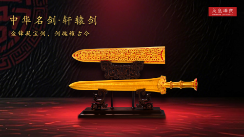 英皇珠宝以敬畏之心重溯古法工艺,推出“金生世艺”系列,“金生世艺”寓意“金生万象,世相传,艺韵天成”,以“鎏金、花丝、锤揲、掐丝、錾刻、累丝、镶嵌、珐琅彩”古法八大工艺,结合新式国风'古韵新释’创意,将黄金焕变成极具生命力的时代瑰宝。现场展出的“典藏摆件”中华十大名剑之轩辕剑,正是采用古法手工錾刻结合珐琅彩工艺匠心打造。