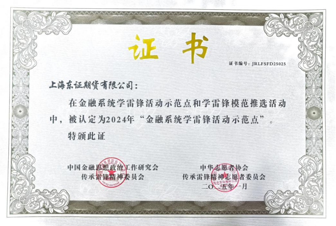 近日,经中国金融思想政治工作研究会传承雷锋精神委员会与中华志愿者协会传承雷锋精神志愿者委员会审核与认定,上海东证期货有限公司获评“2024金融系统学雷锋活动示范点”荣誉。