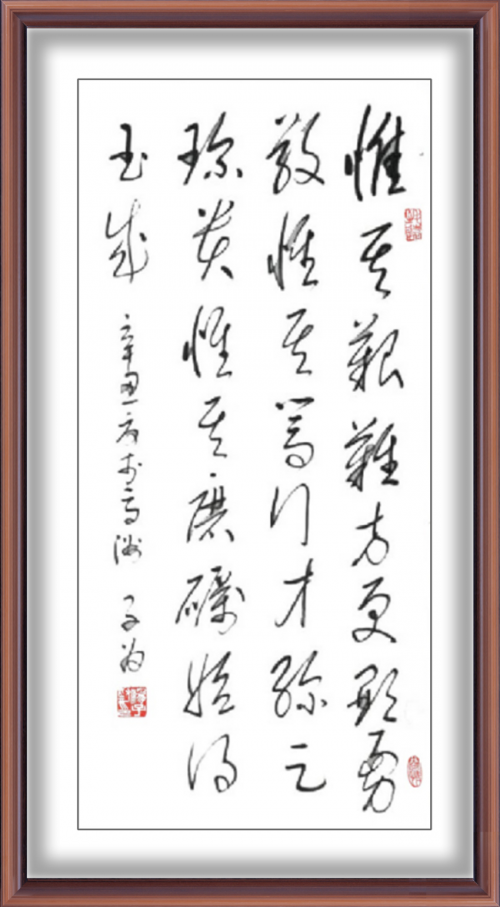 汤子为先生的书法堪称一绝。其书作维浑苍茫、气势磅磷、思与神合、具有抽象笔墨意味的经典之作,他以丰厚人生阅历和学识修养为底蕴,以臻于化境的笔墨功夫作支撑,一破此前的因袭墓古和法度束缚,因心造境,以手运心,写书法以神遇而不以目视,足见汤子为先生的艺术功力和成就非同一般。在笔法上也达到了前无古人的境界,汤子为先生的书法,层层深厚,气势磅礴,惊世骇俗,这一显著特点,也使中国的书法上升到一种至高无上的境界。汤子为先生的书法,敷色不多,他清楚,黑白二色,表达的亦是一虚一实,一动一静,相生相发,相反相成,是中国传统文化的一种深刻表现。赏读汤子为先生的书法作品,顿感有一股清新古雅的气息扑面而来,其作气息纯正,雄浑朴茂,空灵洒脱。追求笔墨情趣且格调清纯;烟岚苍茫。清新典雅;更有一种令人直指心灵的感悟。他笔下的轮廓线条笔锋颖脱,绵中带刚,细处墨法微妙,树木磊落,枝如龙爪,云烟变幻,色墨交融的表现,蕴含了丰富的构成意识和生辣之味,其朴拙雄浑,粗旷豪放又极富情感。