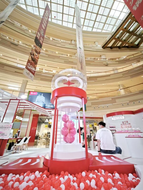 龙湖龙湾天街作为江宁区的潮流地标,聚集了大量热衷尝新、追求品质的年轻消费群体。敷尔佳此次快闪店选址商圈核心地段,在设计上采用年轻潮流风格,以红白相间的色调为主,搭配创意装置与互动式体验区域,完美呼应"科技护肤,医研共创"的核心理念,不仅打造出兼具时尚感与打卡属性的潮流地标,还为消费者营造出沉浸式的护肤体验空间。