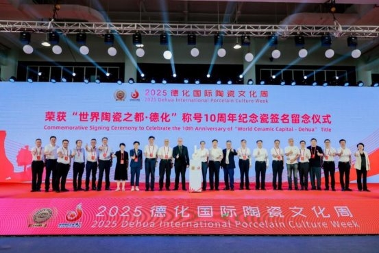 “世界陶瓷之都・德化”称号十周年纪念瓷签名仪式现场,中外嘉宾共同签名留念(活动主办方供图)