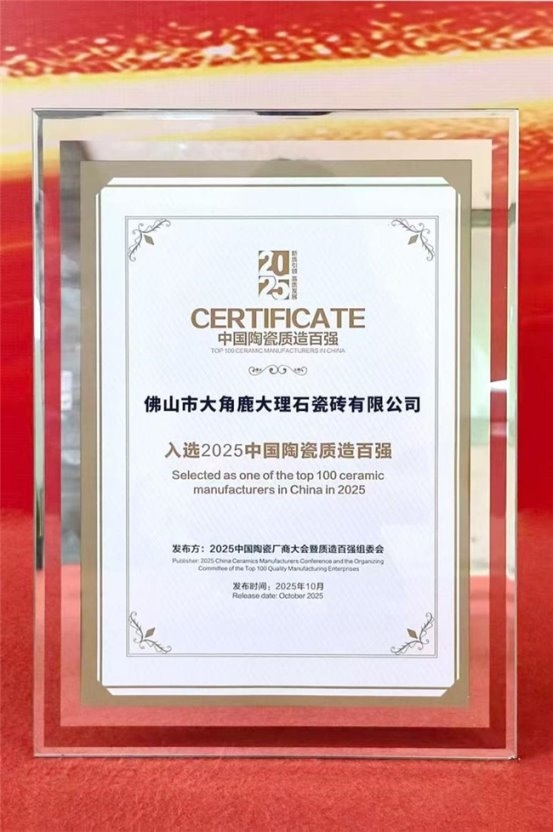 此次荣登“2025中国陶瓷质造百强”,是对大角鹿技术创新、智造实力的高度肯定,也标志着其在新国标时代成为中国建陶高质量发展的引领力量。未来,大角鹿将继续以“5A”质造为基准,夯实产品力,升维品牌力,打造具有全球影响力的中国瓷砖品牌,携手行业伙伴共启中国陶瓷“质造强国”的新篇章。