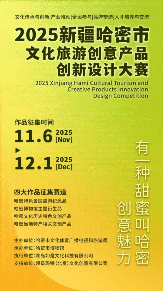 近日,“创意魅力 有一种甜蜜叫哈密——2025新疆哈密市文化旅游创意产品创新设计大赛”正式启幕。本次大赛由哈密市文化体育广播电视和旅游局主办、哈密市博物馆承办,青岛如是文化科技有限公司执行,超级玛特(北京)文化创意有限公司提供支持,面向全国征集兼具哈密特色与市场潜力的文旅创意产品,助力当地文旅产业高质量发展。