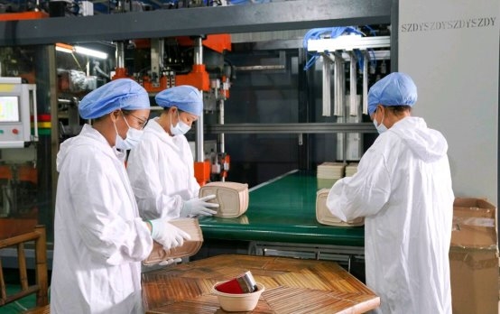 “这个竹粉盒子,别看它普普通通,可是大有乾坤,科技感满满。” 广东竹笙笙科技有限公司负责人袁秀平说道,通过回收废弃麻竹笋简、笋壳和竹子,研发全降解竹生物基材料制成的一次性餐盒、刀叉勺、农膜,杯子等。这些竹制餐具使用创新型专利配方全降解复合材料,以可再生竹纤维原材料为主,全生物降解材质在土壤和自然环境下,128天可以自然降解93.8%,大大减少对环境造成的污染,获得了欧洲CE认证、FDA认证、德国TUV莱茵与SGS检测、国家标准认证,成功打入了欧盟,美国,印尼等国际市场。“以竹代塑”不仅直接提高当地笋农收入,进一步增加绿色产业产值,而且有效破解塑料污染难题,使群众美丽的家园更加健康、可持续,充满绿意生机。
