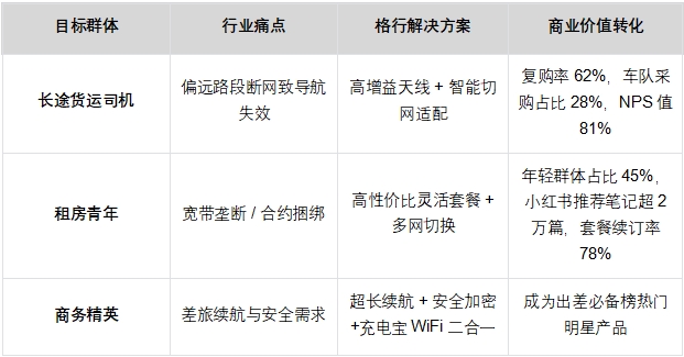 长途货运司机王师傅的反馈极具代表性:“跑全国线时其他设备常断网,格行在山区和很偏的地方都有网,去年设备屏幕坏了线下点直接免费换新,现在车队 30 多辆车全用它”;深圳跨境电商林女士则称:“直播半年没掉过线,客户问链接我直接推”。32% 的 “老带新” 转化率,使格行获客成本较行业低 40%——“ 最好的营销是让产品成为用户的社交货币 ” 。