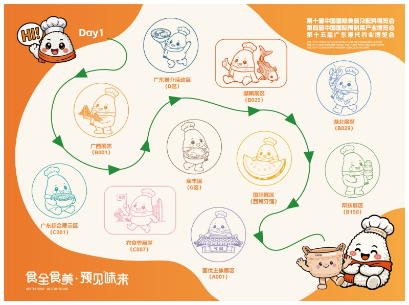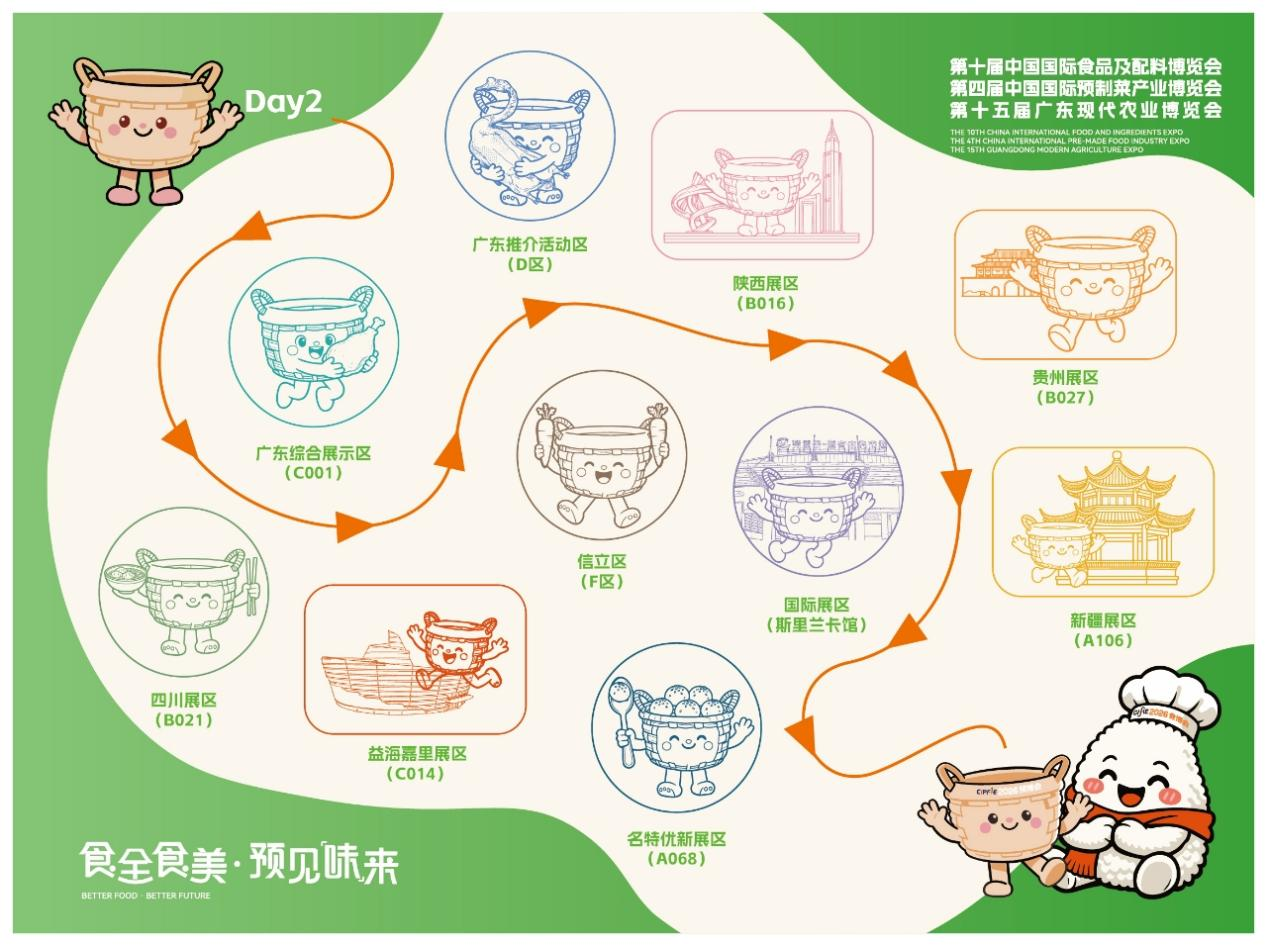 为提升活动的趣味性与参与感,活动设置两日不同打卡路线,精准覆盖展会核心展区。Day1路线串联广西展区(B001)、广东综合展示区(C001)、农食莞品区(C007)等十大展区,涵盖地方特色农产品、帮扶产品与国际美食;Day2路线则聚焦广东综合展示区(C001)、四川展区(B021)、国际展区(斯里兰卡馆)等特色点位,让观众全方位领略不同地域的农食特色与文化底蕴。