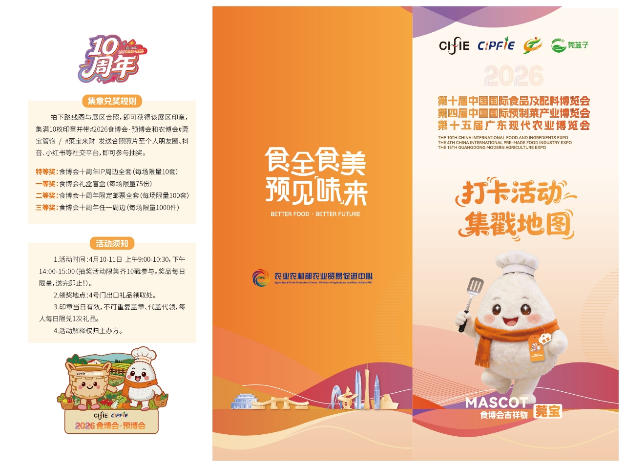 集章兑奖规则清晰明确,兼具参与感与仪式感。观众在每个打卡点拍下路线图与展区的合照,即可获得该展区专属印章,集满10枚印章后,带话题#2026食博会·预博会和农博会 #莞宝管饱 / #菜宝来财,将合照发布至朋友圈、抖音、小红书等社交平台,即可参与抽奖。本次活动奖品围绕食博会十周年专属定制,涵盖特等奖食博会十周年IP周边全套、一等奖食博会礼盒盲盒、二等奖食博会十周年限定邮票全套及三等奖食博会十周年任一周边,每日限量发放,先到先得,为观众送上十周年专属福利。